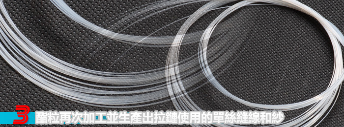 本公司堅持使用穩定的原料以確保產品的品質,因此我們使用的再生聚酯單絲是由新百全企業股份有限公司(亞洲最大拉鏈單絲生產商和再生拉鏈單絲生產商)所生產,而再生環保紗則是由宜進實業(亞洲前三大加工絲生產企業)所供應.